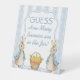 Peter rabbit with a blue jacket and garden vegetables baby shower guess game table sign. A cute bunny in a blue jacket standing in veggie garden for a baby boy baby shower pastel blue vintage stripped background table sign, personalized Peter Rabbit baby shower table decor, baby shower signs, Peter Rabbit baby shower party supplies, baby shower games sign