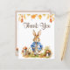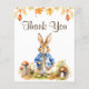 Peter rabbit fall themed baby shower template thank you card, a cute bunny in a blue jacket with mushrooms and fall leaves, nice for autumn time functions.