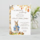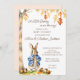 Peter rabbit fall themed baby shower template invitation digital download, a cute bunny in a blue jacket under the oak tree acorns and fall leaves, nice for autumn time functions.