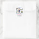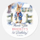 Peter rabbit winter themed birthday party favour thank you stickers, a cute bunny in a blue jacket and red scarf standing in front of snowy winter cottage for winter time functions.