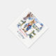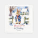 Peter rabbit winter themed birthday party tableware personalised napkins, a cute bunny in a blue jacket and red scarf standing infornt of snowy winter cottage for winter time functions.