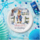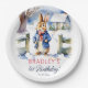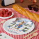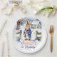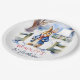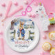 Peter rabbit winter themed birthday party tableware personalised party plates, a cute bunny in a blue jacket and red scarf standing in fornt of snowy winter cottage for winter time functions.