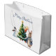 Peter the Rabbit with balloons and a Christmas tree and snowman