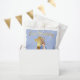 Peter the Rabbit on a Blue Background with gold "First birthday" text with gold number one.