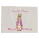 Peter the rabbit in a pink jacket with a beige linen fabric background.