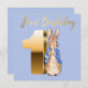 Peter the Rabbit on a blue background with gold "First birthday" text with gold number one.