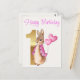 Peter the rabbit with pink heart shaped balloons and Happy First birthday greeting