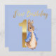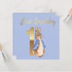 Peter the Rabbit on a Blue Background with gold "First birthday" text with gold number one.