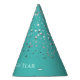 This party hat is shown in a Turquoise Blue colour with a print of fun silver petite stars all over it.