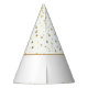 This party hat is shown in white with a print of fun golden petite stars on it.