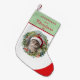 Your furbaby's first Christmas is a happy time and it is worth making it memorable. This Christmas stocking is a perfect way to decorate your home for holiday, stuff some gifts for your pet and also to keep as a nice souvenir for years to come. The stocking is printed with a hand painted watercolor Christmas wreath, your pet's photo and a red script text to customise.