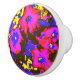 A vibrant blue, purple, red, yellow and black pop art design of petunias.