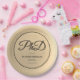 Paper plates for a PhD graduation party with a black, grey, and gold-tone (non-foil) design and the word PhD in a script font.