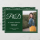 A vertical photo announcement for a PhD graduate. This design has white letters with the word PhD in a script font and a green background (the paper is currently set to a shimmer paper type to give the announcement more emphasis). The photo is a template that is meant to be swapped out for your own. All the words can be customised.