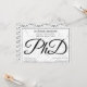 A PhD graduation party invitation with black text and a white marble background. This invitation also has a pattern of the word PhD, in script, on the back. Add your information, add this invite to your cart, and celebrate this major accomplishment.