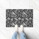 Doormat in a William Morris, Art Nouveau wallpaper design of pheasants and hares set among leaves, vines and flowers - subtly textured white on a black background