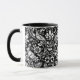 Mug in a William Morris, Art Nouveau wallpaper design of pheasants and hares set among leaves, vines and flowers - subtly textured white on a black background