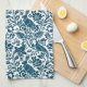 Kitchen towel in a William Morris, Art Nouveau wallpaper design of pheasants and hares set among leaves, vines and flowers - indigo / denim blue on a white background