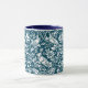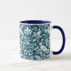 Mug in a William Morris, Art Nouveau wallpaper design of pheasants and hares set among leaves, vines and flowers - subtly textured white on an indigo / denim blue background