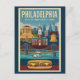 Philadelphia retro vector travel design. Philadelphia is one of America’s most historic cities, known for its Revolutionary-era landmarks, rich cultural heritage, and iconic foods. From Independence Hall to lively neighborhoods and museums, it blends deep history with modern urban energy.