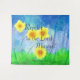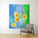 Inspirational quote scripture tapestry depicts beautiful hand painted yellow sunflowers against a blue sky. It features Bible Verse Philippians 4:4, "Rejoice in the Lord Always."