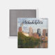 This is the beautiful skyline of the city of Philadelphia, taken from a bridge crossing the Schuylkill River. The architecture of the skyscrapers and buildings of Philly are on display in this photo. Centre City, the downtown area of Philadelphia, is the focus of this photograph. Pretty clouds hang overhead in the summer sky.