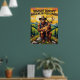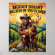 This imaginative painting showcases a thoughtful Bigfoot, a true "Philosophical Perch" performer, wearing a cowboy hat and overalls, sitting on a rock in a beautiful valley. He is tenderly holding a deer in his lap, and a sign with the iconic message "BIGFOOT DOESN'T BELIEVE IN YOU EITHER" stands nearby. The vibrant, textured brushwork creates a lively and emotional atmosphere, perfectly conveying the "Philosophical Perch" vibe of this unique wilderness scene.