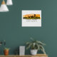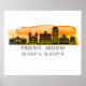 Poster design features Phoenix, Arizona city skyline silhouette with sunset watercolor splash background and latitude & longitude map coordinates.