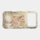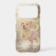 A minimalist phone case design featuring a cute puppy playing in the rain under soft golden sunlight. The puppy wears a pastel pink skirt and a small pink bow on her right ear. Surrounding her are simple plants and delicate flowers in muted earth tones and soft pastels. The overall design is clean and uncluttered, with a calm, dreamy aesthetic and a gentle, cozy feel.
