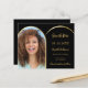 On front: Add your own vertical size photo. A faux gold photo arch frame. A classic black background, golden text. Templates for a name and date. The name and the text: Save the Date are written with a modern hand lettered style script.