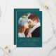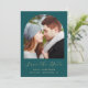 This simple, minimalist Save the Date card features a boho photo arch above the words "Save the Date" in elegant gold-coloured handwriting script, followed by the couple's names, wedding date and city in sans serif font on a teal blue background. Add a more detailed message with additional information on the reverse, along with a QR code that sends guests to your wedding website.