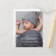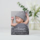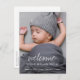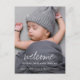 This simply charming photo birth announcement postcard features a contemporary design that's easily customised with your baby's photo, details and your message. Along with the full photo format, we've made 'welcome' the focus, presented in lower case a modern script that's at once tidy and legible but also expressive, warm and familiar. The 'welcome' script and the other text on the card's front is a crisp white. You can change the colour and font of this or any other text according to your own taste, and we invite you to play with these elements. For example, you might change the 'welcome' part of the design to something else, such as 'introducing' or 'hello, world!' etc. And you can always change the size of the text if your own version is too long to fit the space If you prefer a more minimalist look, you can delete without replacing any of our sample stats-you might not want to include the time of day or length, for example. We've set the background on the back as transparent, to let the colour of your paper simply serve as the base tone. You can change this by choosing a colour instead, be it a soft blue or pink or anything else. On back, we've added some placeholder text for you to replace with your own message. You can change the font and/or the text colour as well. The default text colour on the back is a grey tone. After you delete our placeholder text, you might decide to simply leave the back message part of the card entirely blank, so that you can add a handwritten message with your signatures after you receive your cards. Or you might enter a message and then sign the cards by hand after you receive them, rather than entering your names when you edit the other text. In any case, please do remember to remove all of the placeholder text on the back including the sample return address, placeholder text and sample names as well as the sample details and photo on the front! The default paper type, matte, has a soft warmth to it and resists smudging, so it's a great choice for writing your own message. But you can easily change it to semi-gloss if you prefer. Use the intuitive design tools, your favourite photo and your inspiration to personalise this custom birth announcement postcard and make it uniquely yours!