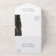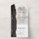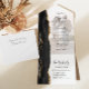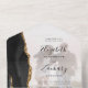 The left-hand edge of this elegant modern all-in-one wedding invitation and RSVP features a black watercolor agate border trimmed with faux gold glitter. The customisable black text overlay combines charcoal grey handwriting, copperplate and italic fonts over a photo of your choice, softened with a white filter to highlight the text. The return address appears on the outside flap and on the reverse side of the detachable RSVP card.