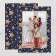 Vintage and elegant Christmas holiday card framed on a deep blue background with gold Christmas star pattern. Personalise your name in modern red typography.