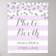 Photo booth sign poster for baby shower, bridal shower, birthday or wedding in light lavender purple and white stripes pattern with silver glitter effect confetti, please note silver is photographic effect only. Perfect for a baby shower, wedding, or bridal shower.