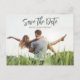 This design features save the date wedding elegant, stylish calligraphy cute unique, vintage handwritten beautiful simple, modern traditional minimalist minimal, photo couple picture 1 one, white text engagement chic trendy, teal whimsical script typography font, budget photo save the dates, engaged full photo bleed overlay, modern calligraphy handwritten script