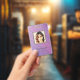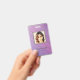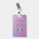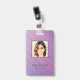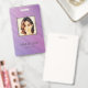 Modern photo business ID identification card with barcode over a purple and pink diagonal stripes background. Additional information can be added to the backside of this business ID badge