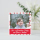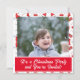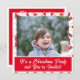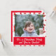 Design features your photo on front, with patterned background of Santa caps, Christmas stockings and candy canes. Centre front area displays your text in white cursive against a red, rectangular backing. Reverse side features an all-red background to your text, displayed in same white, cursive font. Time and place info is displayed in an easy-to-read print. Designed to coordinate with the First Christmas Collection
