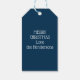 Poinsettia family photos Christmas gift tags with custom message with year and stylish navy blue and white floral clip art.