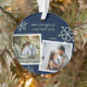 Photo collage christmas ornaments for newlyweds, in blue and white, featuring the words "first Christmas as mr. and mrs." and 2/two pictures (front), while the back features a multi-photo template with 4 images and monogrammed heart, with editable colour. Easily customise with year, single monogram initial and favourite pictures.