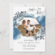 Gorgeous four photo, blue watercolor and blue floral and foliage Wedding Save the Date card. On the front, attractive geometrical fame encased by flowers and foliage with you image inside and cascading blue watercolor stain on the back. Use of modern hand written calligraphy details. On the back three photo collage with elegant small frame with your initials joining all three photographs together. Part of our "Rustic Blue Mountains Collection" with a variety of coordinating products available.