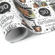 A fun photo collage 30th birthday wrapping paper with a customised name to wrap all you birthday gifts in. Bold graphics of a cake, present, party hat and cupcake in Black and White..