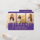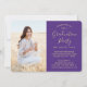 Share the joy of a high school or college graduation and invite family and friends to celebrate with these custom 4 photo collage purple and gold invitations. All pictures and wording are simple to personalise. (IMAGE PLACEMENT TIP: An easy way to centre a photo exactly how you want is to crop it before uploading to the Zazzle website.) This template is formatted for a graduation party, but can easily be customised as an open house invite or announcement card. Simply change the text to include any details of your choice, such as parents' names, special honours, degree title, favourite inspirational quote, graduate's future plans or new address. If there's any text not wanted simply delete it. Design features a purple background, faux foil mortar board cap, handwritten style script calligraphy, modern minimalist typography, and four photos of your choice, such as senior pictures or images from the commencement ceremony. Please note that gold is printed colour, not metallic foil. This elegant graduation invitation card is a trendy and chic way to begin your special day celebration. Congratulations to the graduate!