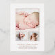 Classic girl birth announcement card featuring a minimalist design with a photo collage with three of your favourite pictures. Below is baby's name, birth stats and the parents' names in real rose gold foil. The back has a simple pink and white stripe pattern. This elegant design is a great way to announce the arrival of your baby girl.