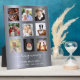 Create your own unique photo collage. Use four, 9 of your favourite photo. With the text: in loving memory. Personalise and add a name and dates. A faux silver metallic looking background, white text.