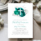 This elegant first communion invitation features a white cross on a background of teal green flowers and set off by delicate silver faux foil and glitter foliage. The customisable text combines teal handwriting script and charcoal grey copperplate font on a white background. Easily replace the sample image on the back with a vertical photo of the guest of honour.