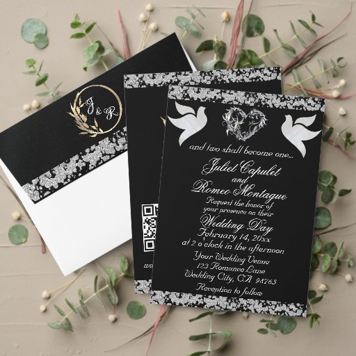 This romantic design features an elegant black background with glitter borders, placeholder for couple's photo, a delicate silver heart & doves with the date for the event in elegant script on the front. The back has a monogram placeholder, more info and place for your website on the back. Also available with different coloured backgrounds for your wedding theme colours. (Glitter is simulated in the artwork). Designed to coordinate with the "Two Shall Become One - Hearts, Doves & Glitter" Wedding Collection. To change details, click «Personalise». Replace photo with your own. To move the text or change the text size, font, or colour click «Click to customise further»