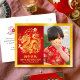 “Happy New Year” faux gold foil typography in both Chinese and English, a stunning visual of a graphic faux gold foil dragon, clouds and stars, your names, and the photo of your choice overlay a traditional Asian red circle pattern and brushed faux gold foil border on the front. On the back are a red cloud and star visual, your personalised note, and return address. Feel the warmth and joy of the holiday season whenever you send this stylish yet modern, personalised 2024 Chinese Lunar New Year of the Dragon photo postcard. Make sure someone special receives this greeting!