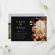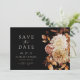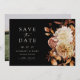 Photo Fall Leaves Wedding Save the Date. This elegant wedding program hand fan features hand-painted watercolor burnt orange and terracotta leaves, cream and beige dahlias, and beautiful rust-coloured roses on a black background. The back includes a matching floral and leaf bouquet with more text to personalise. Find matching items in the Black Autumn Romance Collection.