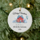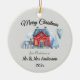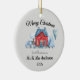 Go whimsy with this classic round ceramic ornament featuring a watercolor illustration of a cute red and blue winter house with lights and snow trees, "Merry Christmas" greeting, "first Christmas as" Mr & Mrs (name) and year. The background is a platinum color. The design features elegant script and modern calligraphy. The image template on back is set up for you to add one of your favorite pictures. Easily change or remove text and add photo to make it yours using the Template provided. Lightweight and ideal to mail as a thoughtful gift. See "About This Product" information on size and materials.